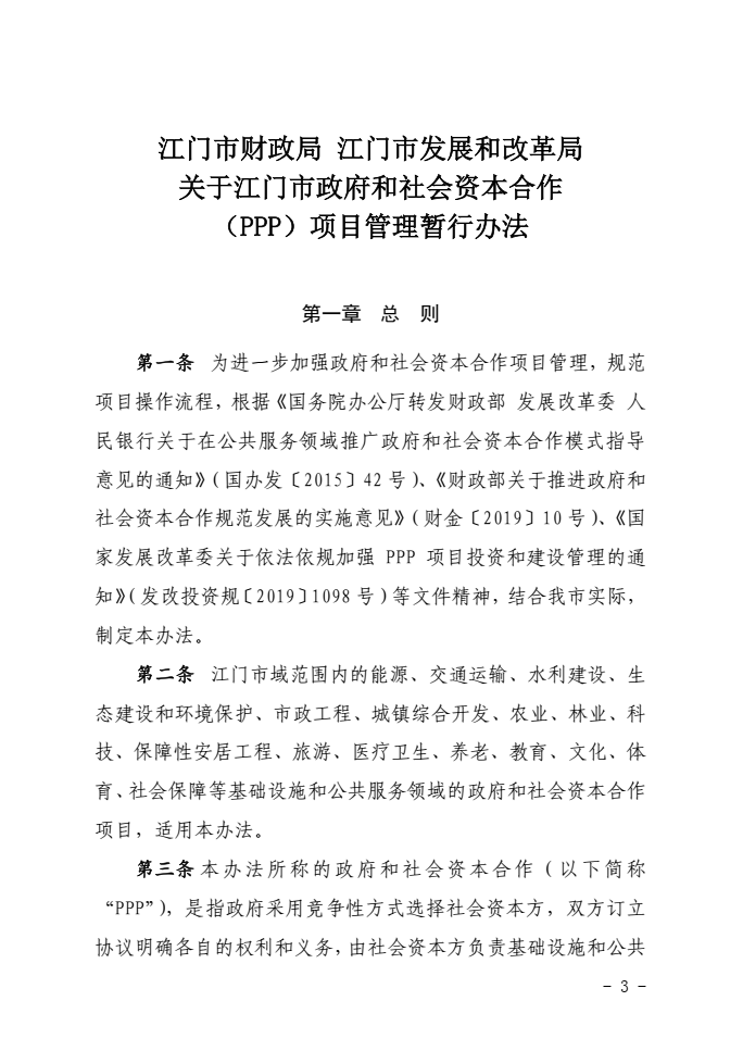 為進一步加強江門市政府和社會資本合作(PPP)項目管理,規(guī)范項目操作流程,江門市財政局聯(lián)合江門市發(fā)展和改革局制定出臺了《江門市政府和社會資本合作(PPP)項目管理暫行辦法》(江財規(guī)〔2022〕1號)(以下簡稱《暫行辦法》),并于2022年4月經(jīng)江門市人民政府同意正式印發(fā)。
